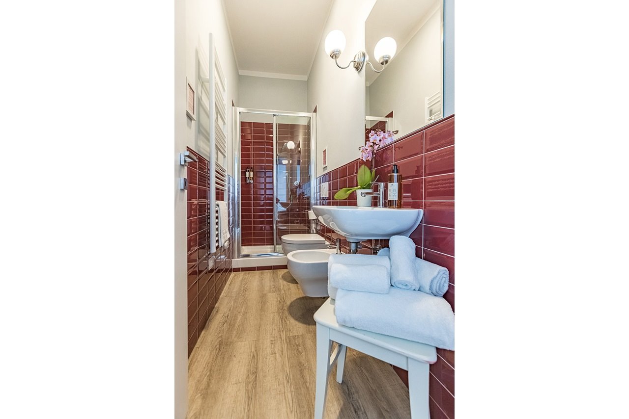 La Camera Sophia, di ben 33 m², è situata al primo piano, è ideale per una famiglia di 4 persone o per una coppia che desidera soggiornare in una camera ampia e spaziosa. È composta da una camera matrimoniale (letto 170x200 cm), uno studio con divano letto alla francese (140x190 cm), un grande bagno con doccia e terrazza con tavolino e sedie.